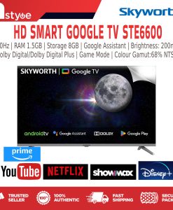 Skyworth STE6600 32”, 40″ 43″ HD G00GLE SMART TV, 1366 x 768 Resolution, 16:9 Aspect Ratio, WiFi, Bluetooth, USB, HDMI – 2 years warranty